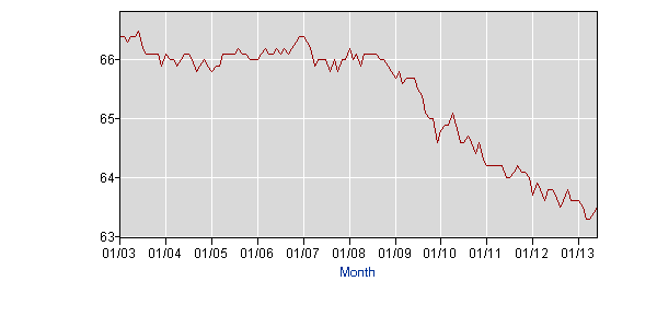 It is being reported today that GDP in Q1 came in lower than initially reported while Q2 is being projected above estimates. Gross domestic product expanded at a 1.7 percent annualized rate in the second quarter, the government reported Wednesday. That's up from the 1.1 percent rate in the first quarter (revised downward from 1.8 percent) and much higher than forecasts of a 1.0 percent rise. So pundits are ecstatic because Q2's initial GDP forecast came in 0.7% higher than expected the same day Q1's revised GDP came in 0.7% lower than was initially projected. Keep in mind that Q1 was initially being expected to come in at 2.4%; it then came in at an initial 1.8% and was revised downward to 1.1%. ![]() And even if GDP growth were 1.7% as reported, that still qualifies as pitiful growth. Almost five years into the economic crisis, we still haven't seen growth that comes close to a typical post-recession recovery. The telling figure is labor participation. This figure tells what percentage of the population 16 and over has a job. ![]() As this graph shows, the percentage of adults that have a job continues to follow a downward trajectory. And in the last four years, the occasional drop in the unemployment rate has generally been due to people leaving the labor market--giving up looking for a job--rather than much of an increase in people finding a job. Unfortunately, today's jubilation about GDP is completely disconnected from reality. Go to the article list |
